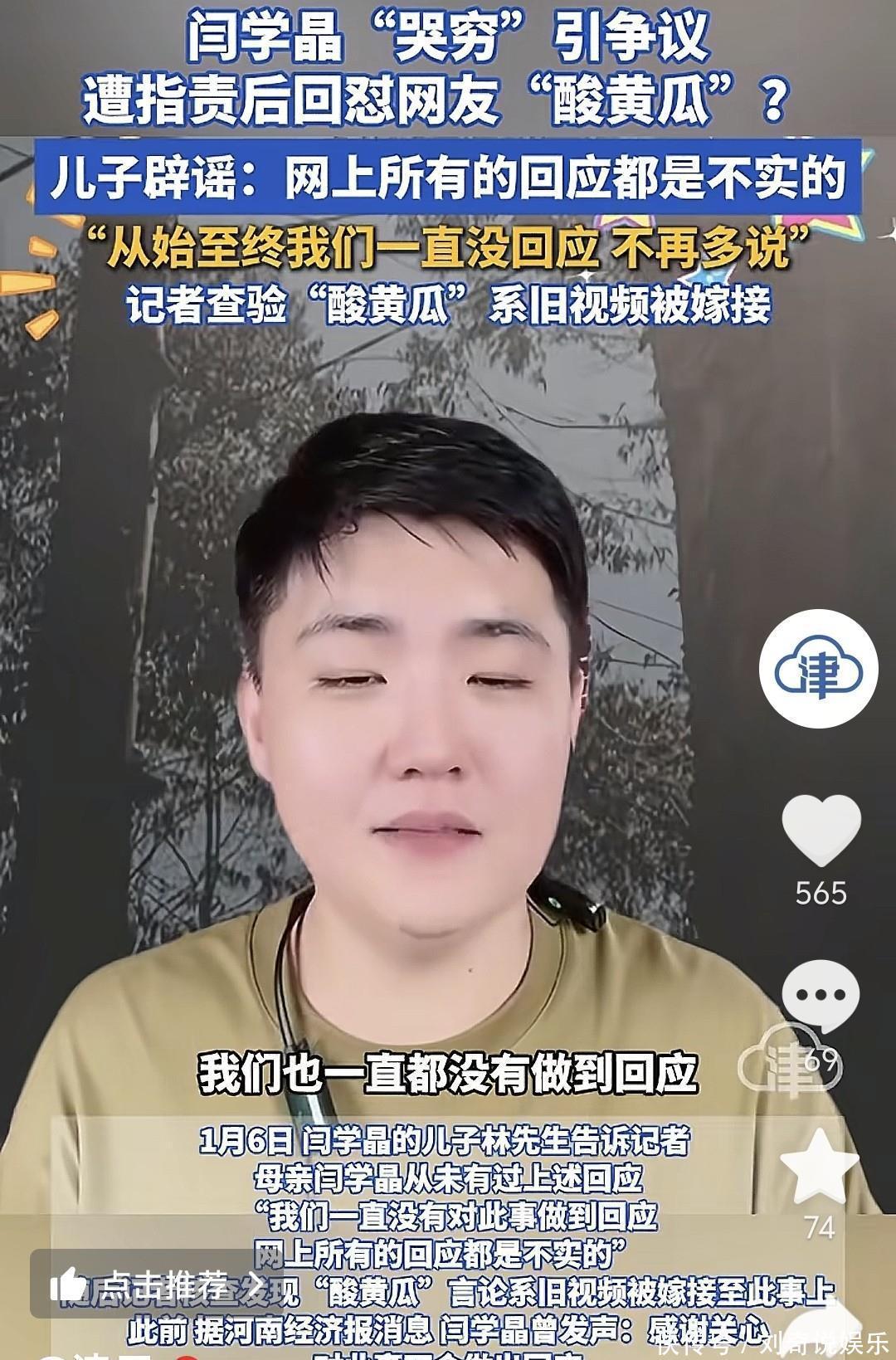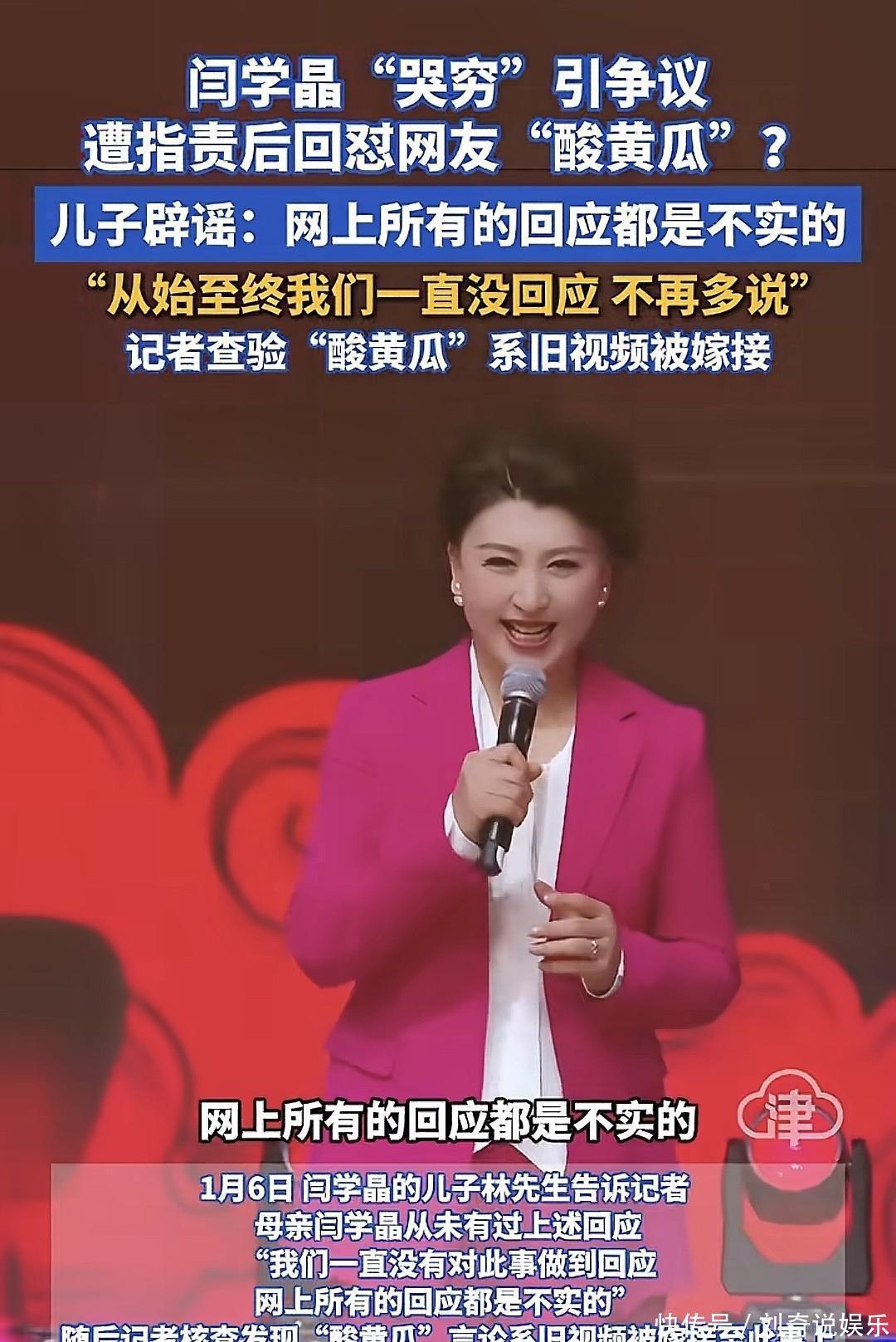 自己母亲闫学晶没有说过上述言论。而且我和我妈都没有对此事有过任何的回应,不再多说。后续也不会再解释的,很明显这是直接冷处理了,毕竟跟在自己身上。至于“酸黄瓜”言论的出处,媒体通过查询系旧视频被嫁接到此事上。