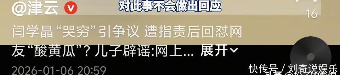 都靠闫学晶来补贴过日子,这番言论直接翻车,表演过界收不了场。甚至还有回怼骂网友“酸黄瓜”等,老艺术家不仅人不老实,嘴更是狠。佐香园被牵连,网友要求更换代言人,法务在评估中。1.6日,媒体《津云》报道网友质疑闫学晶哭穷被骂酸黄瓜的后续,其儿子告诉记者“网上所有的回应都不是真的”,辟谣一下假的。