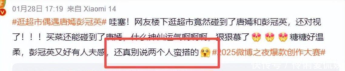 唐女士近来精神头十足,状态好得不得了,前阵子还有人撞见她在超市,跟她一起的正是新戏里的合作伙伴彭冠英。两个人精心打扮后手挽手去逛街,一路上还时不时凑在一起看手机,结果被好多网友撞见了。